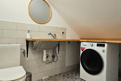 Dalej w korytarzu zaadaptowano miejsce do przechowywania (schowki pod skosami), pralnię z dodatkowym wc oraz przytulną sypialnię z klimatyzacją.