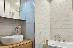 Łazienka na dole - z wanną, pełniącą również funkcję prysznica (deszczownica oraz szklany parawan) oraz z wc. Świetna opcja na domowe spa.