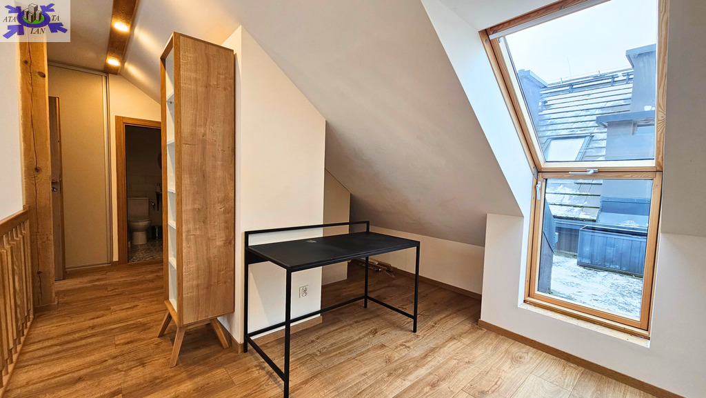 Na antresolę prowadzą drewniane schody. Górny poziom oferuje miejsce na domowe biuro lub bawialnię. Z tego miejsca jest wyjście na przytulny taras o powierzchni ponad 9m2.