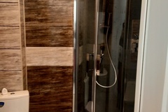 elegancka łazienka z kabiną prysznicową, wc,( pralka).podłogi z paneli i gresu,