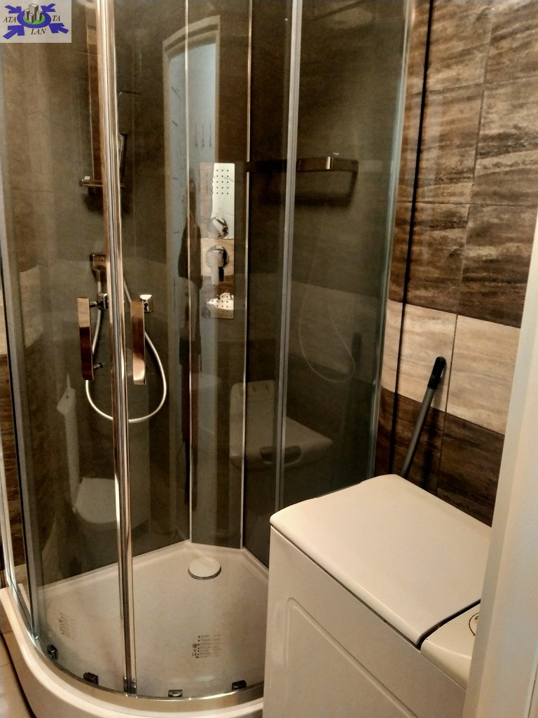 łazienka z kabiną prysznicową i wc, umywalka z szafką, pralka, wykończona w nowej glazurze i tarakocie.