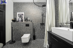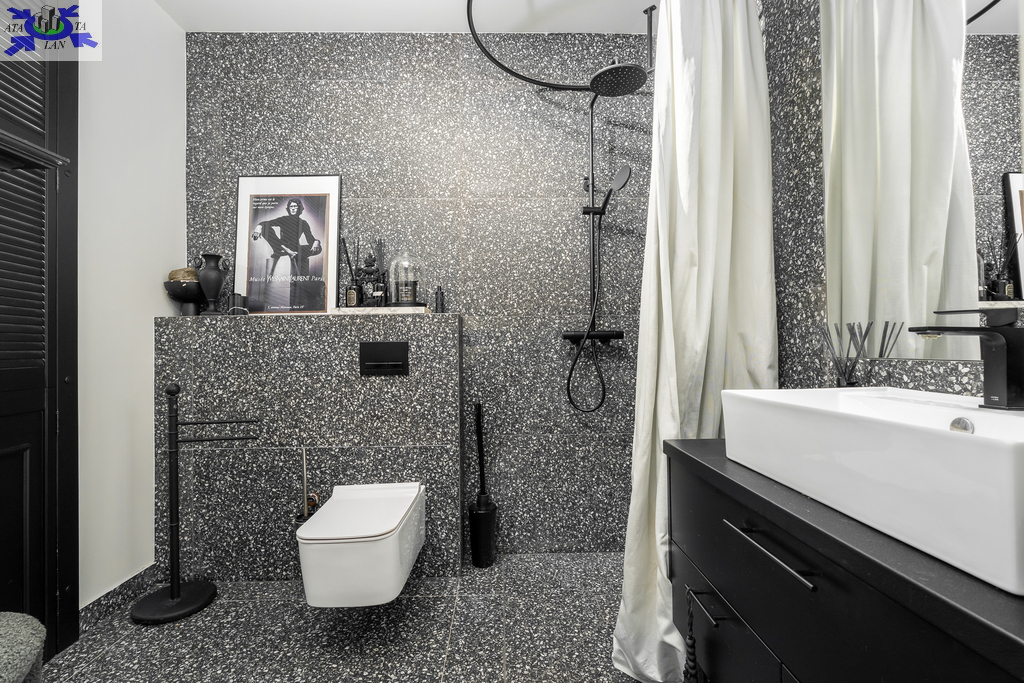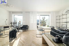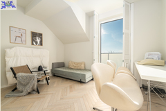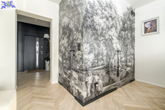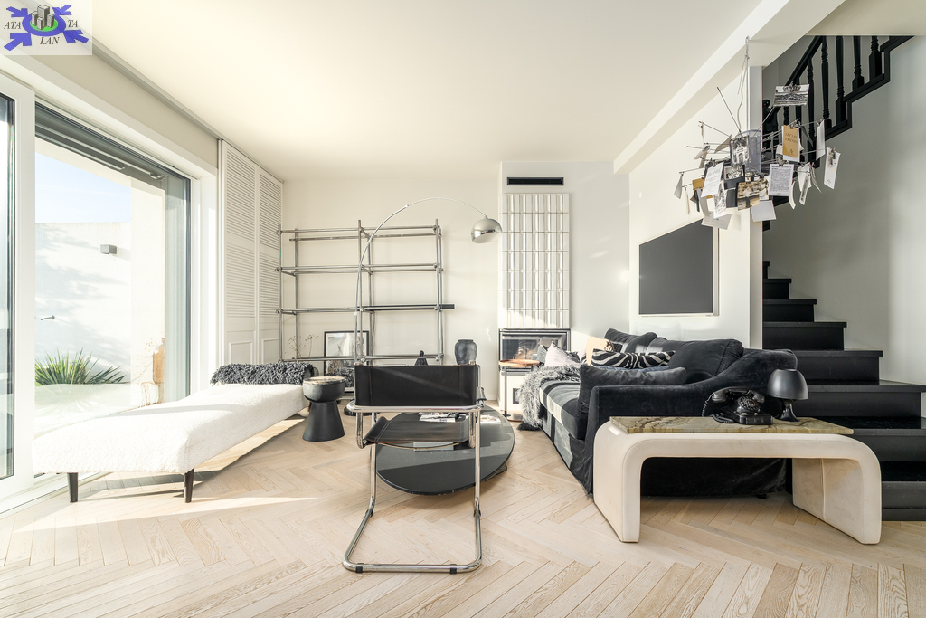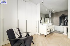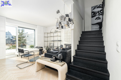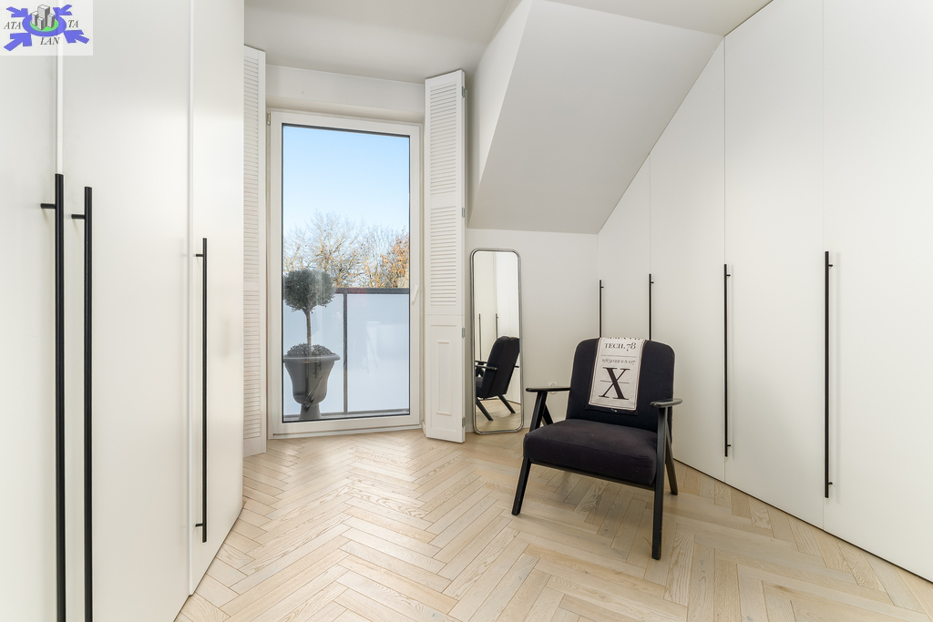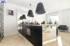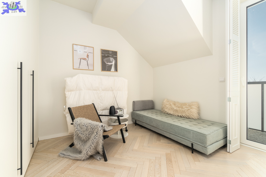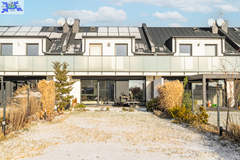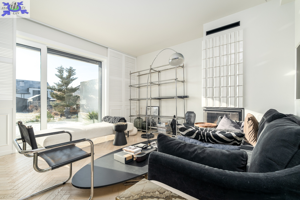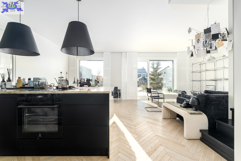 Eko-Luksus Podłoga drewniana układana w jodełkę klasyczną (zero waste). Design w łazienkach Stylowe lastryko w formacie 60x120. Do dyspozycji dwie łazienki na dole z prysznicem, na górze salon kąpielowy z wanną i prysznicem. Kuchnia Blat na wyspie wykonany z naturalnego granitu.Na oknach wewnątrz przemyślany system przesuwnych drewnianych paneli zaciemniających. Detal Schody oraz barierki wykonane z litego drewna. W salonie zainstalowano kominek jak niezależne źródło ogrzewania nadający wnętrzu przytulności. Przestrzeń Dzięki zastosowaniu prostokątnych lukarn, poddasze jest niezwykle ustawne i przestronne. Balkony z nowoczesnymi, całoszklanymi balustradami zdobią dom z dwóch stron.Markiza otwierana elektrycznie dająca zadaszenie nad całym tarasem.