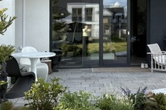 Ogród z instalacją oświetleniową, z pięknymi nasadzeniami i fajnie zorganizowanym tarasem stanowi odpowiednią przestrzeń do relaksu.