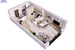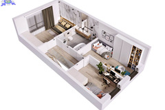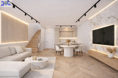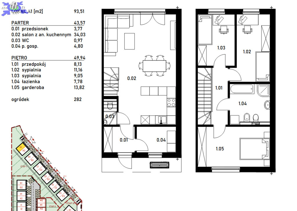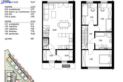 Na parterze znajduje się przedsionek (3,77m2), pomieszczenie gospodarcze (4,80m2), oddzielne WC (0,97m2), oraz przestronna strefa dzienna, na którą składa się salon z aneksem kuchennym (34,03m2) i wyjściem do ogródka (47m2). Na piętrze natomiast mamy duży przedpokój (8,13m2), trzy sypialnie o wymiarach - 11,16m2, 9,05m2 i 13,82m3, oraz łazienkę (7,78m2).