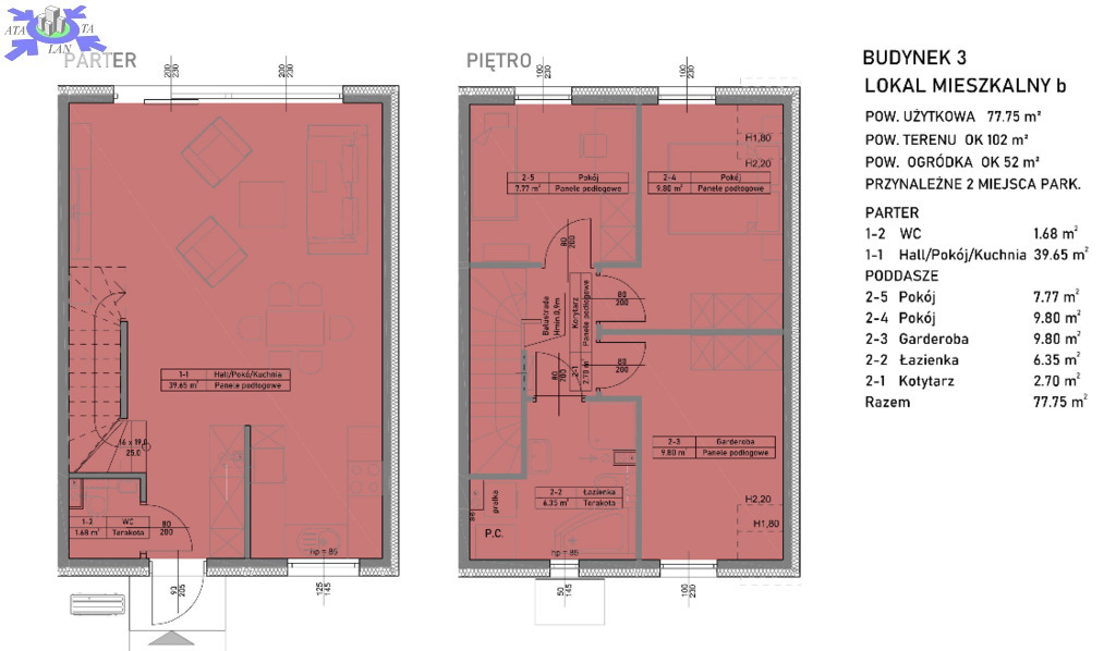 - dwie przytulne sypialnie (7,77m2, 9,80m2)