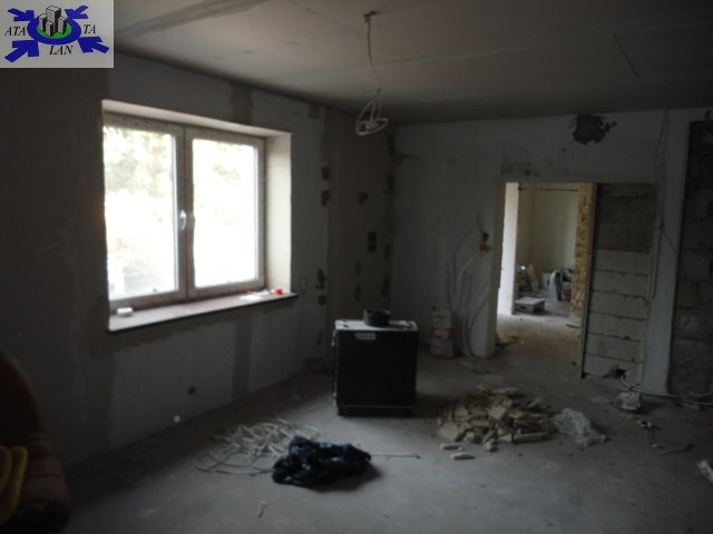 Wykończenie pomieszczeń mieszkalnych na I i II piętrze - na podłogach panele, ściany gładzone i malowane (do odświeżenia), okna pcv z okleiną drewnianą, ogrzewanie z kominka z płaszczem wodnym, kuchnie w zabudowie wyposażone, łazienki urządzone w glazurze i terakocie z białą armaturą. Lokal mieszkalny na parterze wymaga wykończenia, aktualnie jest w standardzie"developerskim". Do dokończenia jest wyłożenie podłóg, malowanie ścian, wykończenie kuchni i łazienki.