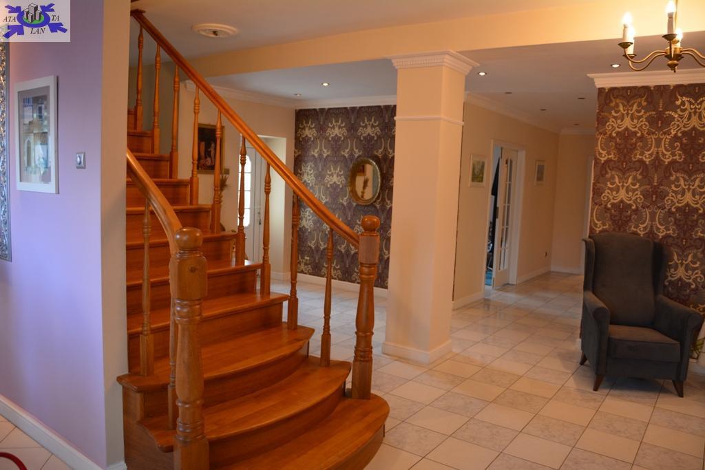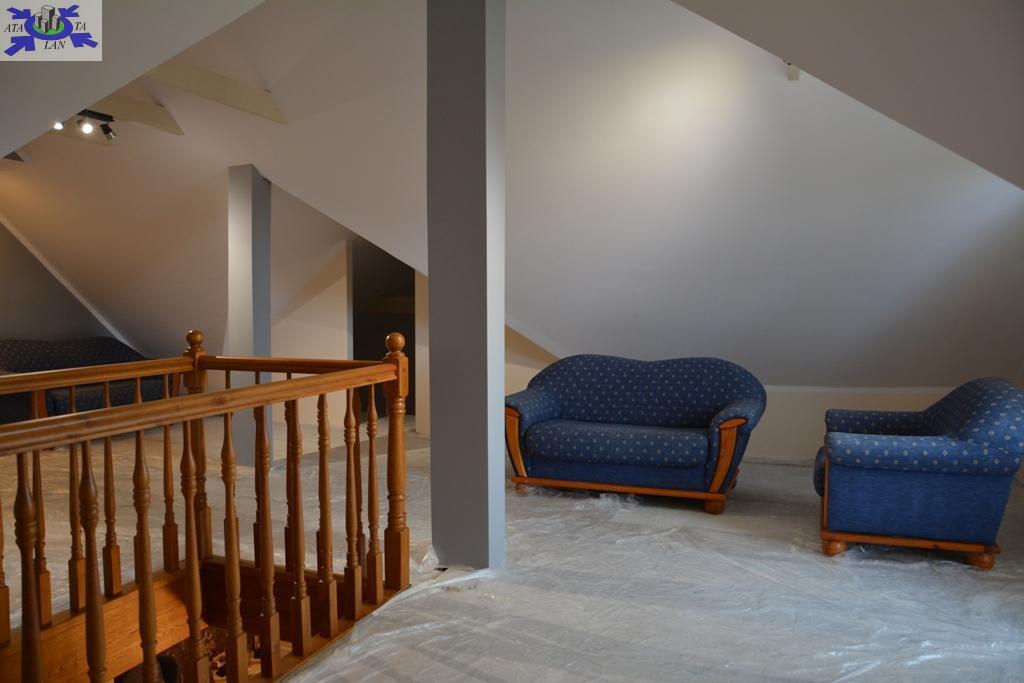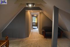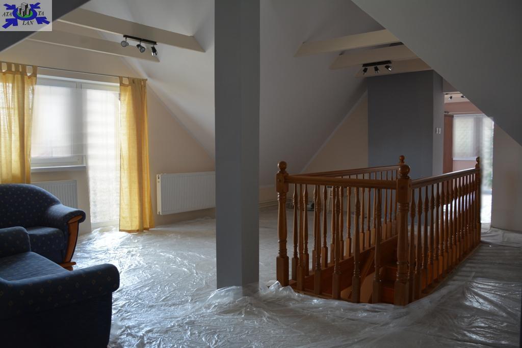 Cały parter wykończono z dbałością o detale. W kuchni, hallu, salonie i na korytarzu na podłodze wysokiej jakości kafle, ściany gładzone i malowane, liczne zdobienia. Duża sypialnia na podłodze panele, ściany gładzone, malowane, również częściowo położono ozdobną tapetę, szafa w zabudowie. Obok mniejszy pokój, pełniący rolę gabinetu. Duży pokój kąpielowy z wanną oraz oddzielna toaleta z umywalką w ładnej, nowoczesnej glazurze i terakocie. Na piętro prowadzą szerokie drewniane dębowe schody. Na piętrze duża przestrzeń typu open space z wyjściem na balkon, trzy pokoje (jeden z wyjściem na osobny balkon), garderoba oraz pokój kąpielowy. Ściany w pomieszczeniach gładzone, malowane. Pokój kąpielowy wykończony ze starannością nowoczesna glazura, terakota, wanna w zabudowie. Z hallu zejście do piwnicy oraz wyjście na duży taras (około 20m2) i ogród.