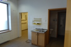 Na podłodze wykładzina, w części kafle, ściany gładzone i malowane. Toaleta w glazurze i terakocie. Sufit podwieszany z zamontowanym oświetleniem rastrowym. Pomieszczenie biurowe z dużymi oknami od strony zaplecza.