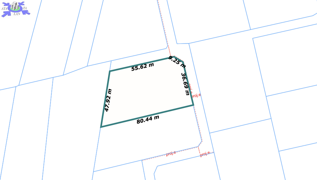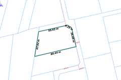 Kształt działki zbliżony do trapezu, wymiary ok. 56m x 40m.