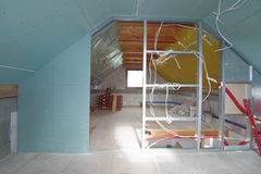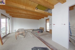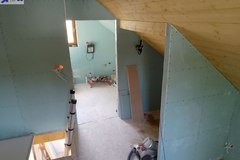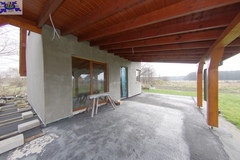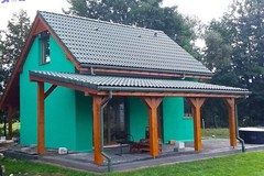 Dom pow. całkowita 70 m 2 ( 35 m 2 parter + 35 m 2 poddasze) . W części dolnej salon z aneksem kuchennym , łazienka z w c . Z salonu wyjścia na zadaszone tarasy po obu stronach domu ( wschód- zachód) . Poddasze to łazienka oraz 1 lub 2 pokoje w zależności od aranżacji i potrzeb.
