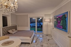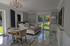 Tapicerowane niezwykle wygodne łóżko kontynentalne zostało wykonane na zamówienie. Sufity zdobią piękne, luksusowe żyrandole sprowadzone z Włoch. W kuchni znajdują się wysokiej klasy meble z pięknym drewnianym blatem oraz sprzęty renomowanej marki BOSCH. W niezwykle szykownej łazience zastosowano wielkoformatowe spieki,czyli kafle bez fug. Biały montaż luksusowej marki Villeroy&Boch, zaś armatura Hansgrohe.