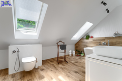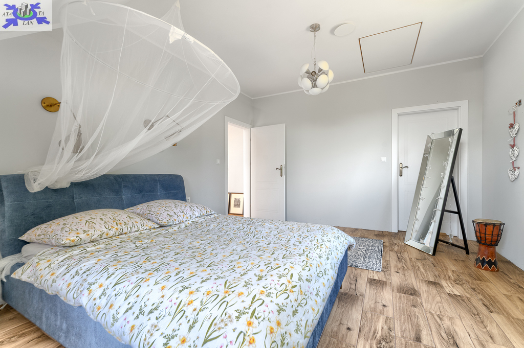 Piętro domu to 3 niezależne sypialnie (jedna z dużą garderobą) i przestronna łazienka z wanną.