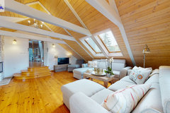 Część mieszkalną znajdującą się na piętrze i poddaszu tworzą