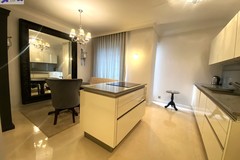 *Kitchen and dining area functionally designed space with high-quality built-in kitchen furniture, high-class household appliances, elegant, free-standing kitchen island, table with chairs