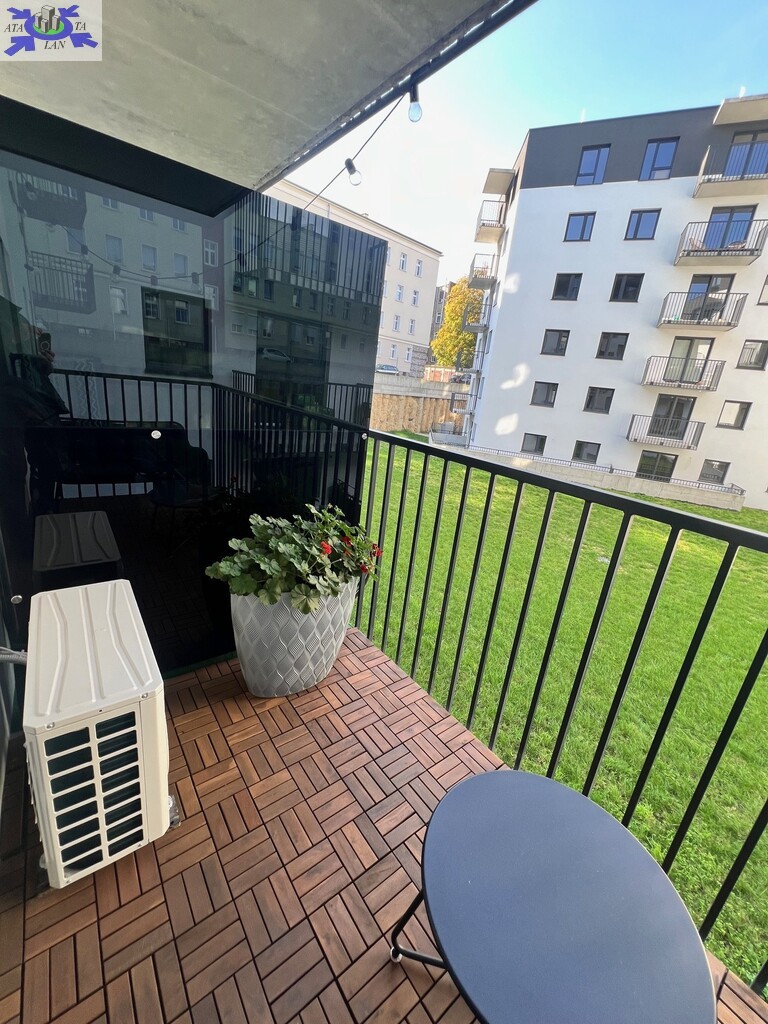 Balkon zapewnia prywatność, dzięki odgrodzeniu szklaną ścianą.