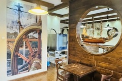 Lokal widoczny z ulicy, z dużymi witrynami znajdujący się tuż przy przeprawie promowej.