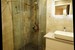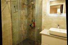 - Łazienka o powierzchni 4,4 m2 uposażona w umywalkę nad którą znajduje się podświetlane lustro, kabinę prysznicową oraz pralkę, na podłodze laminat.