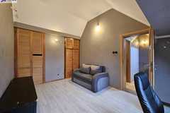 Na II poziom prowadzą schody drewniane. Tutaj mamy 3 pokoje pełniące funkcję sypialni i antresolę.