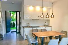 Na parterze pomieszczenia dzienne salon z aneksem kuchennym, łazienkę, przedpokój oraz drewniane schody prowadzące na 2 poziom. Z salonu wyjście na taras. Doskonałe doświetlenie wnętrza zapewniają duże, bezprogowe okna podłogowe, a dla zapewnienia odpowiedniej prywatności automatycznie sterowane żaluzje oraz system alarmowy. Ogrzewanie podłogowe gazowe na całej powierzchni apartamentu. Drzwi zewnętrzne i wewnętrzne drewniane.