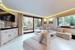 -Salon z kominkiem i aneksem kuchennym z dużymi oknami antywłamaniowymi wychodzącymi na zieleń ogrodu
