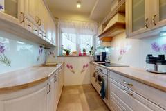 - Pomieszczenia 5 pokoi (salon, 3 sypialnie, biuro) w tym 1 w przyziemiu jako biuro, kuchnia, 2 łazienki, garaż, pomieszczenie techniczne z kolejną toaletą.Rozkład