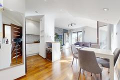 - strychu funkcjonującego jako pomieszczenie do składowania, ale jest wyposażone w okno połaciowe, połacie są obłożone płytami karton-gipsowymi oraz wylana jest posadzka betonowa, więc jest możliwość zaadoptowania jako dodatkowe pomieszczenie o funkcji mieszkalnej,