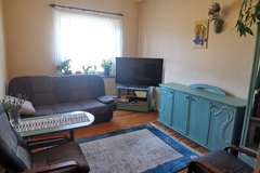 pokój dzienny o pow. ok. 16 m2, na podłodze wycyklinowane deski poniemieckie, ściany gładzone malowane (od strony ogródków - zachód)