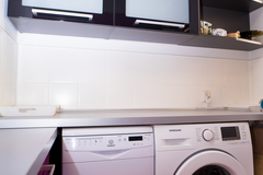 Na podłogach w pokojach i przedpokoju panele, kuchnia i łazienka - terakota.