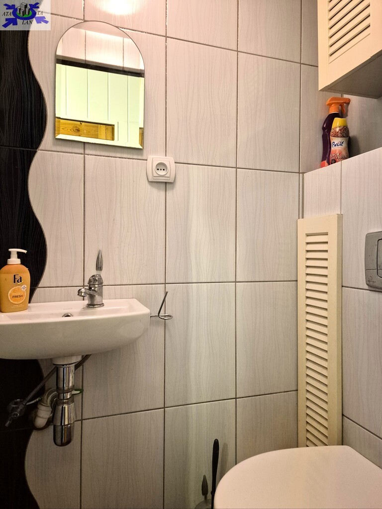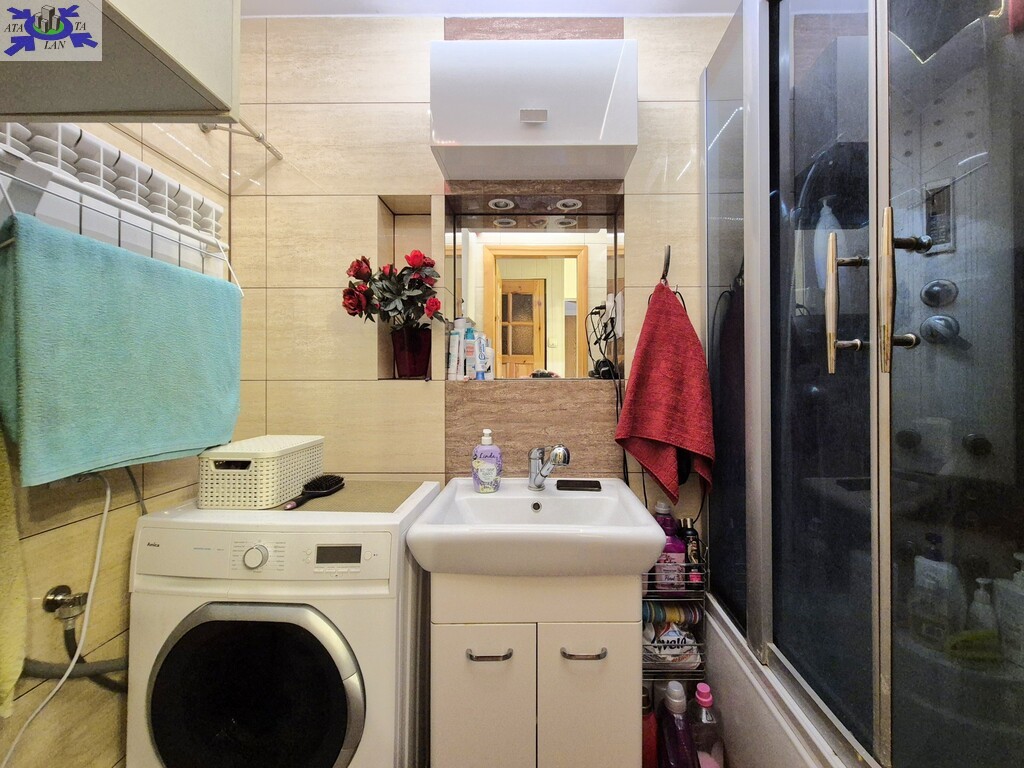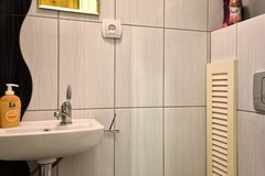 * łazienka z kabiną prysznicową, umywalką i pralką oraz osobno WC z umywalką