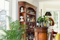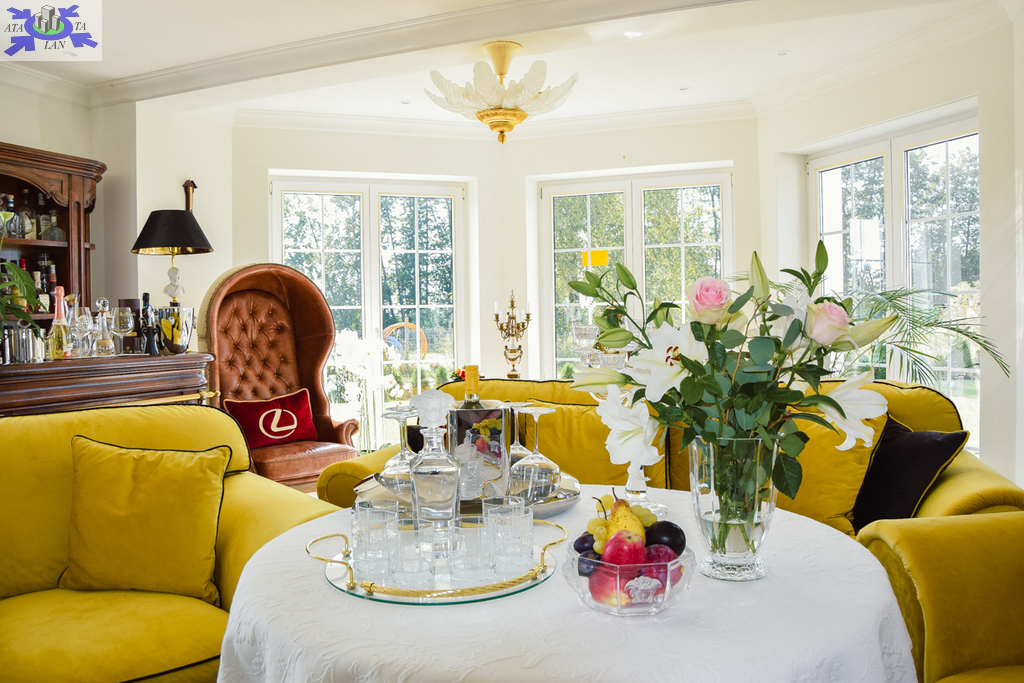 Salon Przestronny, z kominkiem i częścią barową. Idealne miejsce do relaksu i organizowania spotkań towarzyskich.