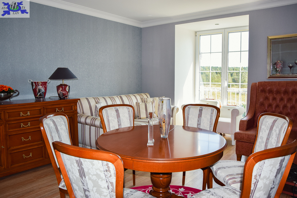 Kuchnia Elegancka, z wyjściem na przestronny taras, wyposażona w najwyższej klasy sprzęt AGD, który zadowoli nawet najbardziej wymagających kucharzy. Na tarasie znajdują się dwa stoły dla gości, co czyni go idealnym miejscem na przyjęcia na świeżym powietrzu. Jadalnia Przestronna, z dużym stołem mieszczącym 14 osób, doskonała na rodzinne posiłki oraz eleganckie przyjęcia.