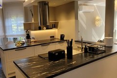 Dom został zaprojektowany i wykończony z pomocą architekta przy użyciu najwyższej jakości materiałów. Wnętrza urządzono ze smakiem i dużą dbałością o detale - oświetlenie, armatura łazienkowa oraz elementy dekoracyjne zostały sprowadzone z Hiszpanii, Włoch i Niemiec. Zasłony wykonane są z jedwabiu, a całe widoczne na zdjęciach wyposażenie może pozostać w cenie nieruchomości.