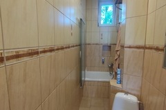 Łazienka z wc - glazura i terakota, wanna z prysznicem.