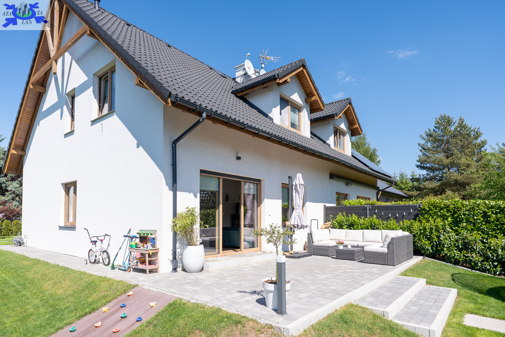 wybrukowany polbrukiem wjazd do garażu, wejście do domu oraz taras , opaska wokół domu, dojście do śmietnikówogrzewanie podłogowe w całym domu. W łazienkach dodatkowo zamontowane grzejniki elektryczneinstalacja pod odkurzacz centralny (konieczność zamontowania jednostki centralnej)instalacja elektryczna - 230V, siła, biały osprzęt Legranda instalacja pod panele fotowoltaiczneinstalacja tvinstalacja hydraulicznasystem rozprowadzenia deszczówkitynki wewnętrze gipsowe, kładzione maszynowoschody wewnętrzne wylewane pokryte drewnemkominekzamontowany zmiękczacz wodyogródek podlewany za pomocą automatycznego systemu nawadniania