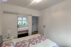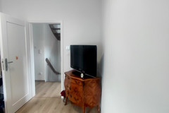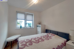 W sypialniach panele, ściany malowane. W jednaj sypialni garderoba ze szklanymi przesuwnymi drzwiami.