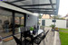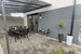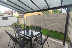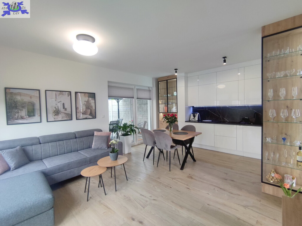 Z salonu wyjście na urządzony i zadaszony taras i ogródek, miejsce do wypoczynku na świeżym powietrzu.
