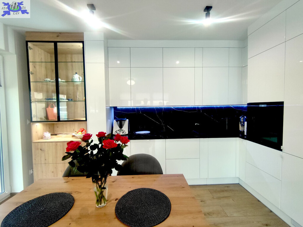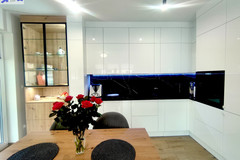 Zabudowa kuchenne na wymiar - białe lakierowane fronty. Blat roboczy z nowoczesnego kompozytu.