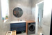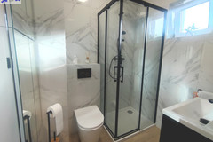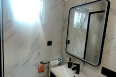 Nowoczesna łazienka z prysznicem typu "walk in", toaleta, ceramiczna umywalka i podświetlane lustro.