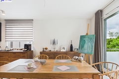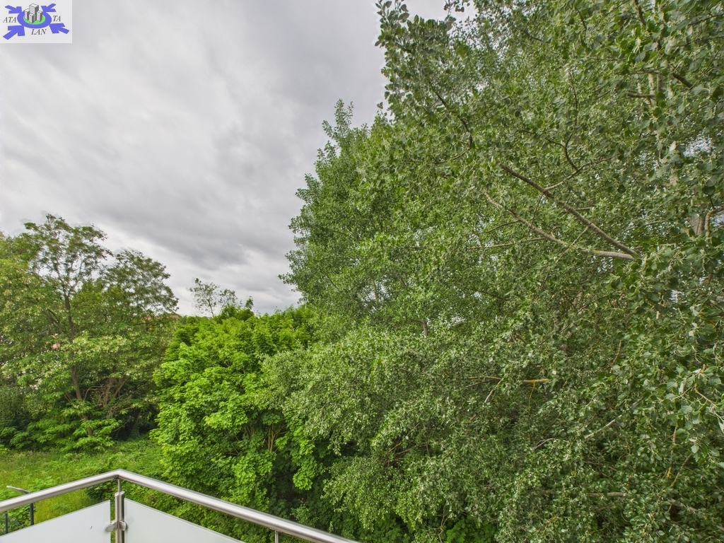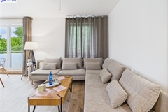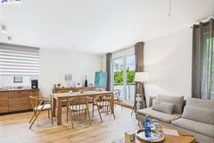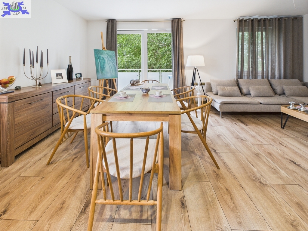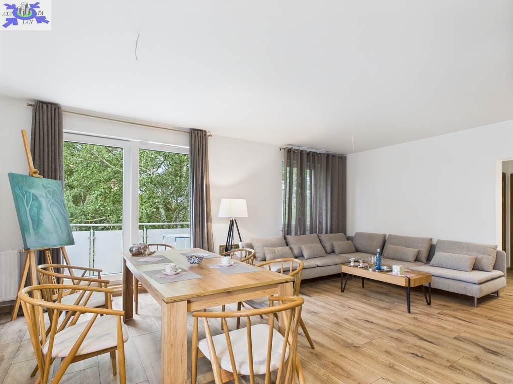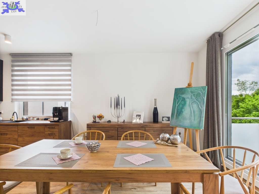 Salon połączony z aneksem kuchennym, doskonale doświetlony dużymi oknami od południowego-zachodu. Z przestrzeni dziennej wyjście na balkon z widokiem na zieleń.