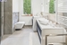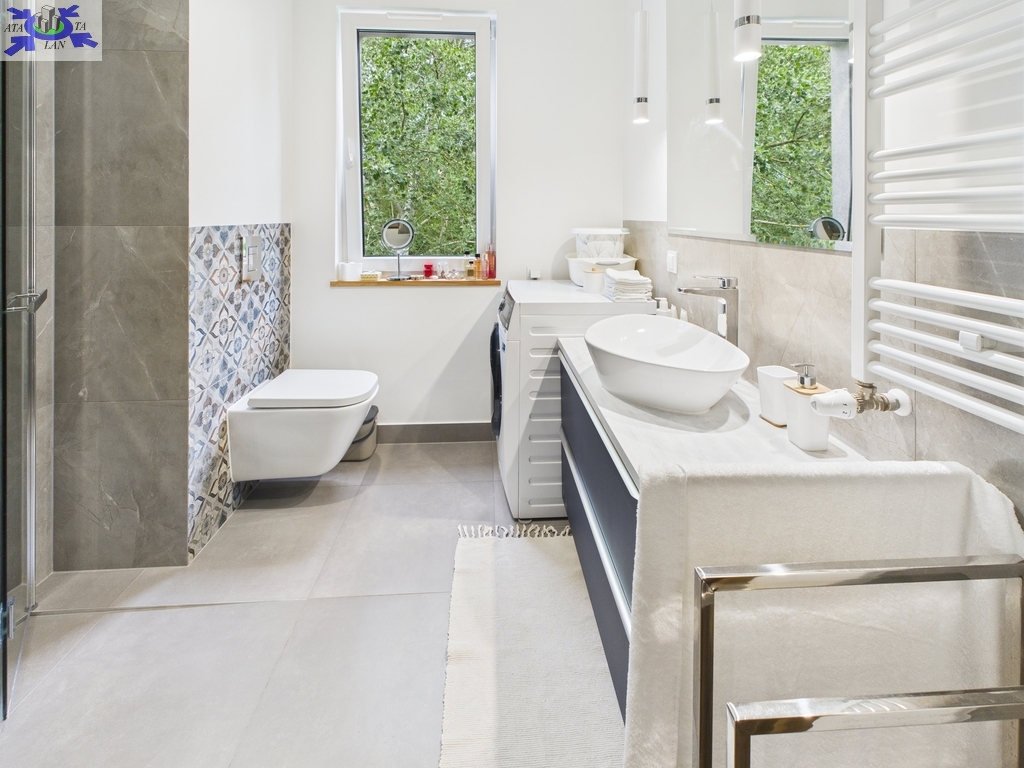 Wykończona dużym gresem w stonowanych szarościach oraz dekoracyjną mozaiką przy prysznicu typu walk-in. Podtynkowa armatura, podgrzewany drabinkowy grzejnik i wygodne miejsce na pralkę.
