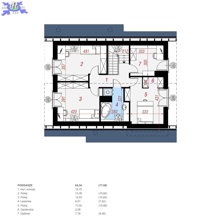 Hol i schody (10,75m2)Pokój (13,35m2)Pokój (13,53m2)Pokój (11,04m2) z garderobą (2,08m2)Pokój (7,78m2)Łazienka (6,01m2)Na działce znajduje się dodatkowe zadaszone miejsce postojowe