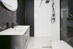 * nowoczesna łazienka z designerskimi elementami czarna armatura, duże lustro, stylowe wykończenia