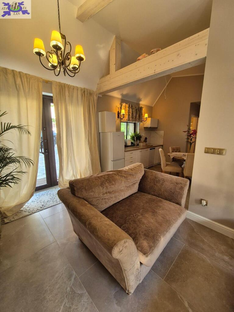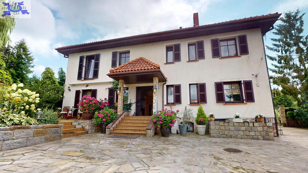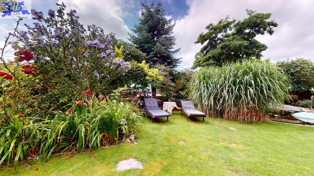 Dom otoczony jest przepięknym ogrodem, liczne nasadzenia, krzewy, oczko wodne, w pełni zautomatyzowany system nawadniania. Na terenie posesji znajduje się również domek gościnny (salon z aneksem kuchennym plus dwie sypialnie, łazienka z wc), sauna i jacuzzi. Standard pomieszczeń - foto.
