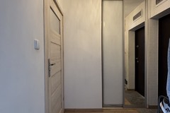 W korytarzu na podłodze gres, szafa w zabudowie.