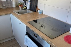 Kuchnia w zabudowie, wyposażona w sprzęt AGD.