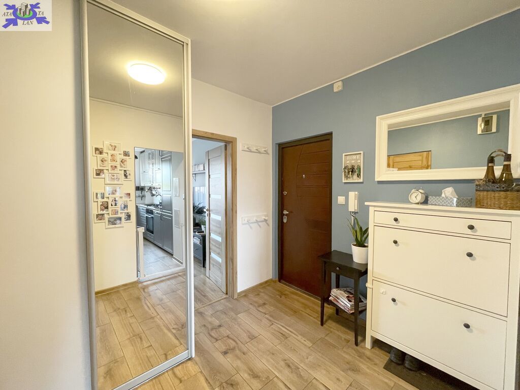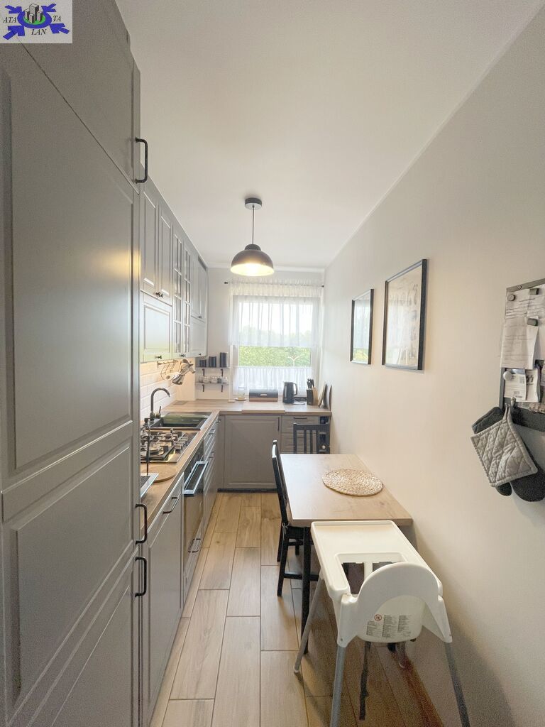 Na powierzchnię 47,54 m2 składa się salon z wyjściem na przestronny balkon, sypialnia , kuchnia w kształcie prostokąta , łazienka, WC oraz przedpokój w kwadracie. Ściany w mieszkaniu wygładzone i pomalowane, na podłogach w pokojach położone panele, w przedpokoju i kuchni na podłodze gres. Okna PCV , w pokoju balkonowym zamontowana zewnętrzna roleta. W kuchni zabudowa mebli kuchennych z AGD ( lodówka, zmywarka, piekarnik elektryczny, płyta gazowa).