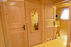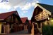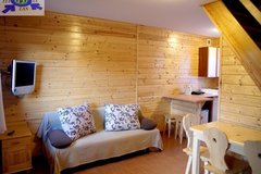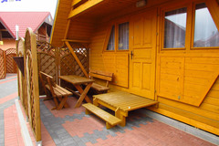 Domki drewniane to 6 osobowe, piętrowe "bliźniaki". Połączone tylnymi ścianami z wejściami po przeciwnych stronach, każda z części posiada balkon. Przed wejściem do każdego domku jest ogródek z meblami ogrodowymi (stół i 2 ławki) ogrodzony pergolami. Domek w całości wykonany jest z drewna.