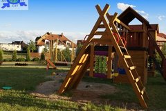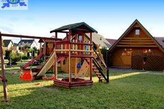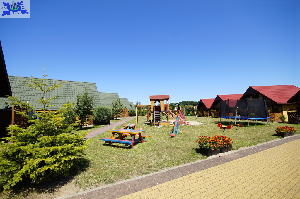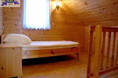Piętro domku to część sypialna podzielona na dwie części. Jedna z nich jest zamknięta, wyposażona w łóżka drewniane z materacami sprężynowymi. Z tej sypialni jest wyjście na balkon. Druga sypialnia to część otwarta (przy wejściu na schody), w której także znajdują się łóżka drewniane z materacami sprężynowymi oraz szafka nocna. Na terenie obiektu znajdują się także parking, plac zabaw dla dzieci, boisko mały ogródek z miejscem do grillowania na własnym grillu oraz plac zabaw z huśtawkami, drabinkami, trampoliną i piaskownicą. Znajdziemy tam zestaw do gry w koszykówkę, a także innych sportów. Dodatkowo obok boiska znajduje się stół do gry w ping-ponga