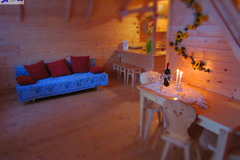 Przed wejściem do każdego domku jest ogródek z meblami ogrodowymi (stół i 2 ławki) jest on ogrodzony pergolami. Wnętrze domku wykończone jest drewnem.