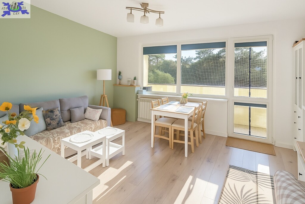Przestronny salon z wyjściem na balkon (4 m2) - idealne miejsce na odpoczynek z widokiem na zieleń.